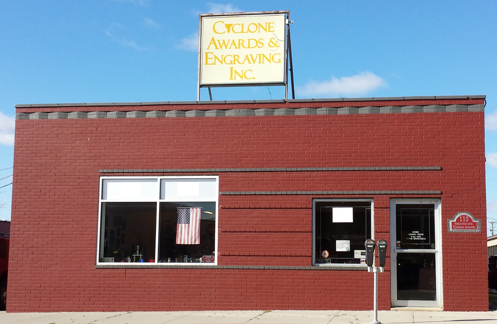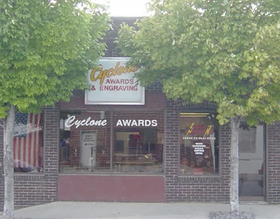 Cyclone Trophy was founded in the 1960’s as a basement enterprise. In 1980 the business was moved to downtown Ames and expanded from strictly trophies to include awards, plaques and name tags. In August of 1987, Cyclone Trophy was purchased by Robert Allen. He renamed it Cyclone Awards & Engraving and moved it to 112 South Washington.